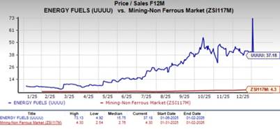 2026-01-05 Energy Fuels (UUUU) wird derzeit mit einem Kurs-Umsatz-Verhältnis (KUV) von 37,18 gehandelt, was einen deutlichen Aufschlag gegenüber dem KUV der Nichteisenmetall-Bergbaubranche von 4,30 darstellt.