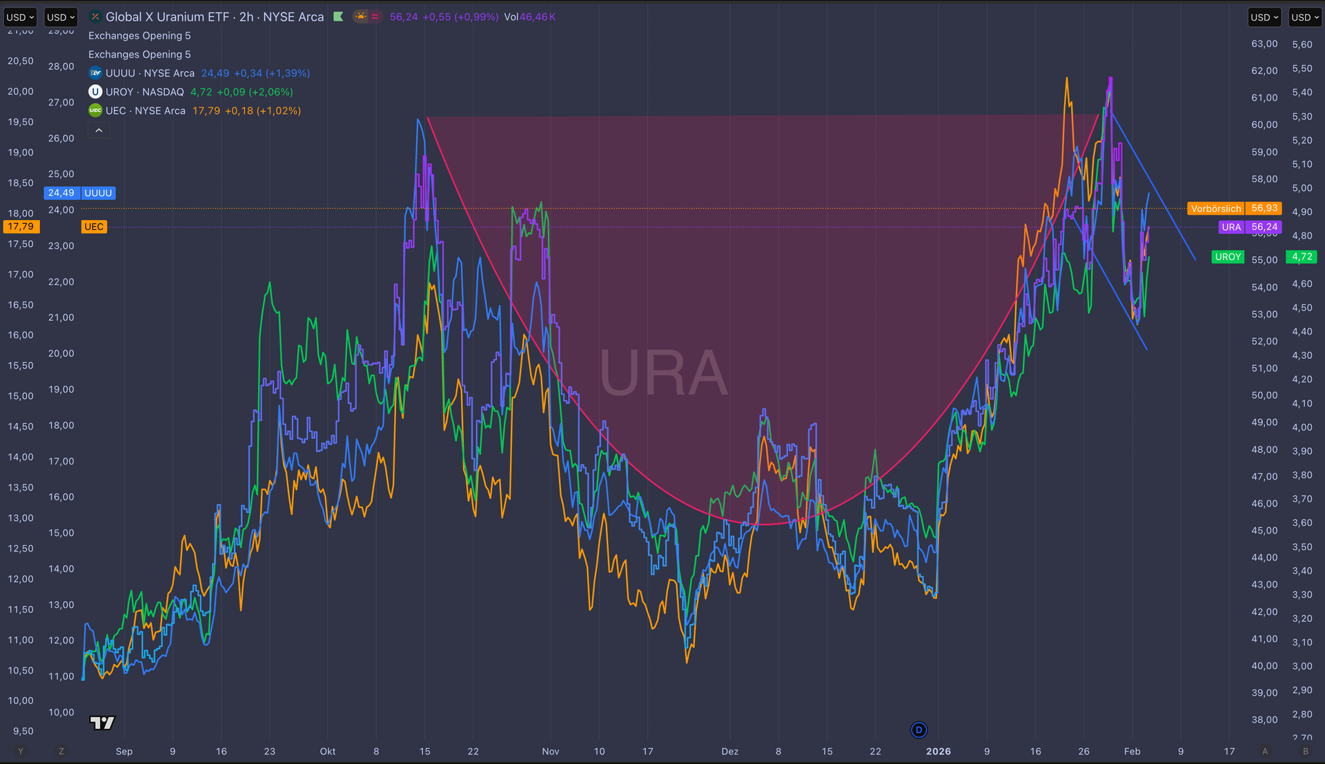 $UUUU setzt die Entwicklung gut fort, nachdem die Fred-Tam-Kerze der letzten Woche ein Signal für eine mögliche Pause und einen Neustart der Dynamik und nicht für ein komplettes Trendversagen gegeben hatte.