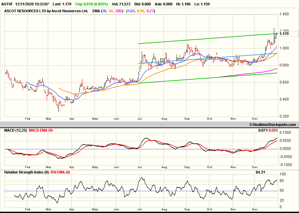 Ascot hat ihre schöne Performance ab dem Coronantief mit fast Kursverfünffachung abgeschlossen mit neuem 3 Jahreshoch 1,179 $ / 1,49 C$.