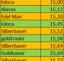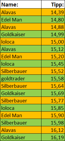 des jeweiligen Gesamteinsatzes der Silberspieler + "x" (s. o.). - Bei Mehrfachbelegung eines Platzes also bspw. zweie ersten Siegern werden die Gewinne der Doppeltipper durch zwei geteilt. Bedeutet, wenn 1. und 2. den gleichen Tipp abgegeben haben, so wird der Gewinn geteilt 50% : 2 = 25 % aller Münzen für beide Erstplatzierten, anzuwenden auch bei mehr als zwei Doppeltipps und auf allen Plätzen analog.