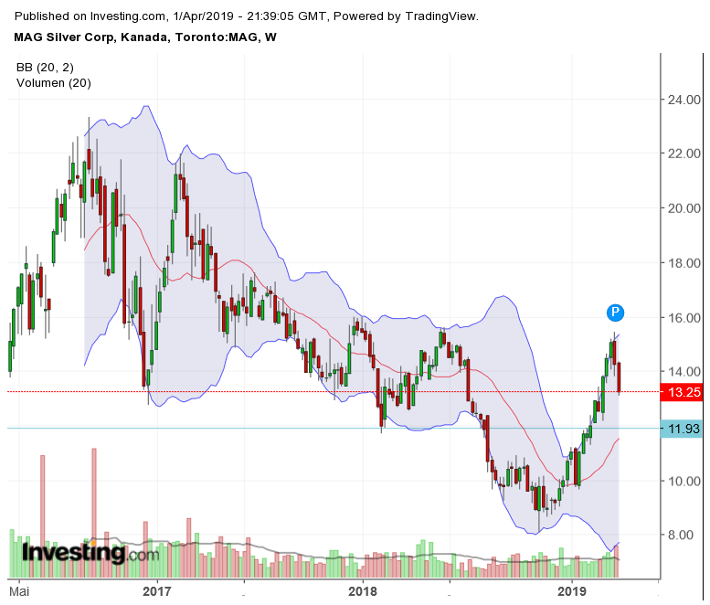 MAG ist von Mitte November 2018 von 8 auf 15,40 C$ am 25.03 2019 gestiegen und korrigiert diesen Anstieg nun. Es gibt keine wesentlichen Insideraktivitäten.