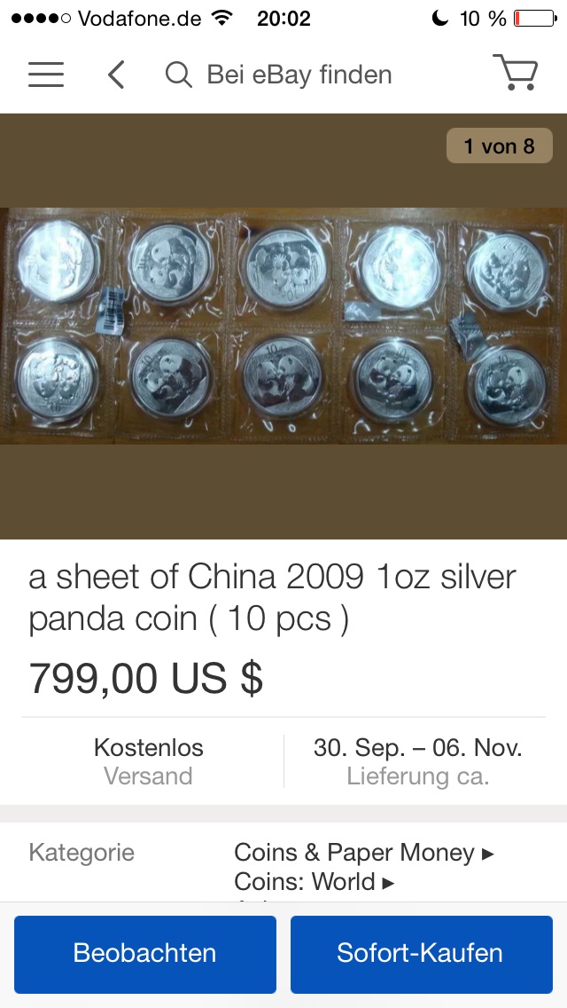 Verdopplung? 20%? 30%? Der 2013er hat damals 21,irgendwas € gekostet. Heute werde ich wohl zwischen 25-27€ verkaufen können. Was macht der Eagle oder Maple, in 2013 gekauft, derweil?Aber eigentlich ging es ja darum, dass der Panda hier als überteuert dargestellt wurde. Das werden wir dann wohl nächstes Jahr sehen....