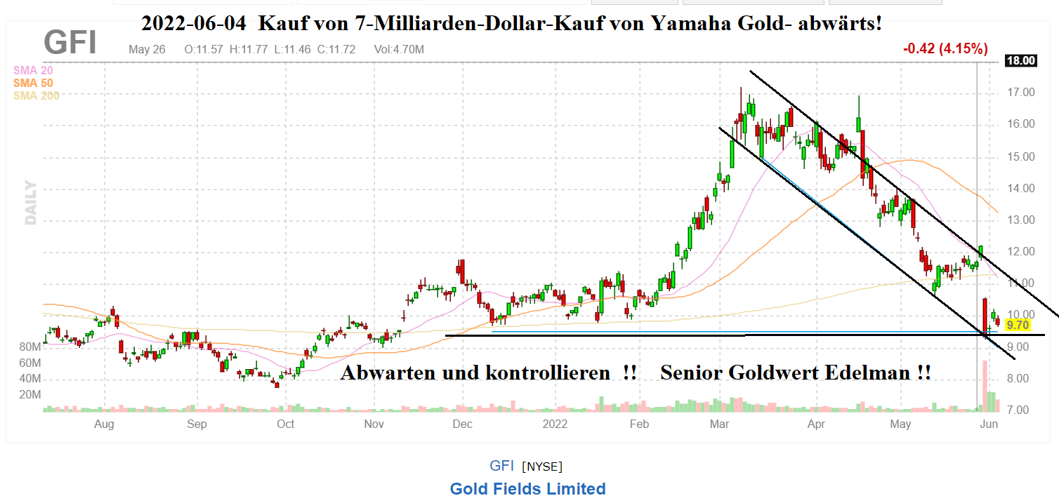 Dann eher noch schnell hierzulande vorbörslich bei Yamana für realtime 5,50 € zugreifen ...Nachtrag: jetzt gehen beide Kurse in die Knie. 5,60 USD (Yamana) und 9,70 USD (Gold Fields).