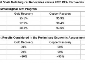 Diese Ergebnisse sind konsistent und übertreffen im Allgemeinen die Gewinnungsraten, die in der vorläufigen wirtschaftlichen Bewertung (siehe Pressemitteilung vom 20. August 2020) verwendet wurden, wo die Gewinnungsraten für Kupfer und Gold bei 90 % und für Silber bei 40 % lagen.