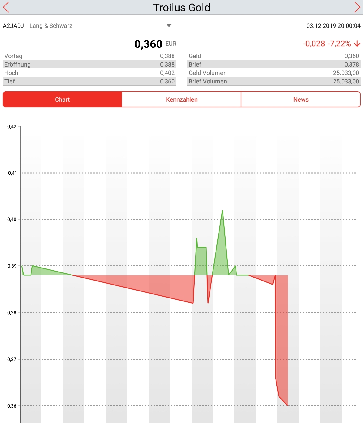 Ich habe mir dann auf Wallstreit online die Geld/Briefkurse in Toronto angesehen. Der Kurs wird regelrecht mit einer Kursstellung von 500 Stücken Geld/Brief nach unten gezogen. - Das kann kein Zufall sein!