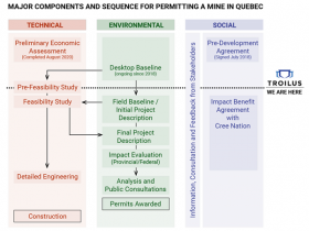 Auf Bundesebene markiert die Einreichung der ersten Projektmitteilung den Beginn der "Planungsphase", in der die IAAC die Öffentlichkeit und die indigenen Völker auffordern wird, sich zu den Schwerpunkten und Prioritäten der ESIA zu äußern und zur Planung beizutragen. Die Planungsphase wird voraussichtlich 180 Tage in Anspruch nehmen und zu einer Reihe von Leitlinien führen, die Troilus bei der Vorbereitung der ESIA befolgen wird. Auf Provinzebene wird das MELCC die ursprüngliche Projektankündigung an das Comité d'évaluation des répercussions sur l'environnement et le milieu social ("COMEV") weiterleiten, um die Auswirkungen des Projekts zu bewerten und Leitlinien für die ESIA zu erstellen, die innerhalb von 30 Tagen erwartet werden. Da die Genehmigung sowohl auf Bundes- als auch auf Provinzebene erforderlich ist, wird Troilus im Wesentlichen ein paralleles Bewertungsverfahren durchführen, das in zwei ESIA-Berichten resultieren wird, um den Bedenken und Prioritäten auf beiden Regierungsebenen Rechnung zu tragen.