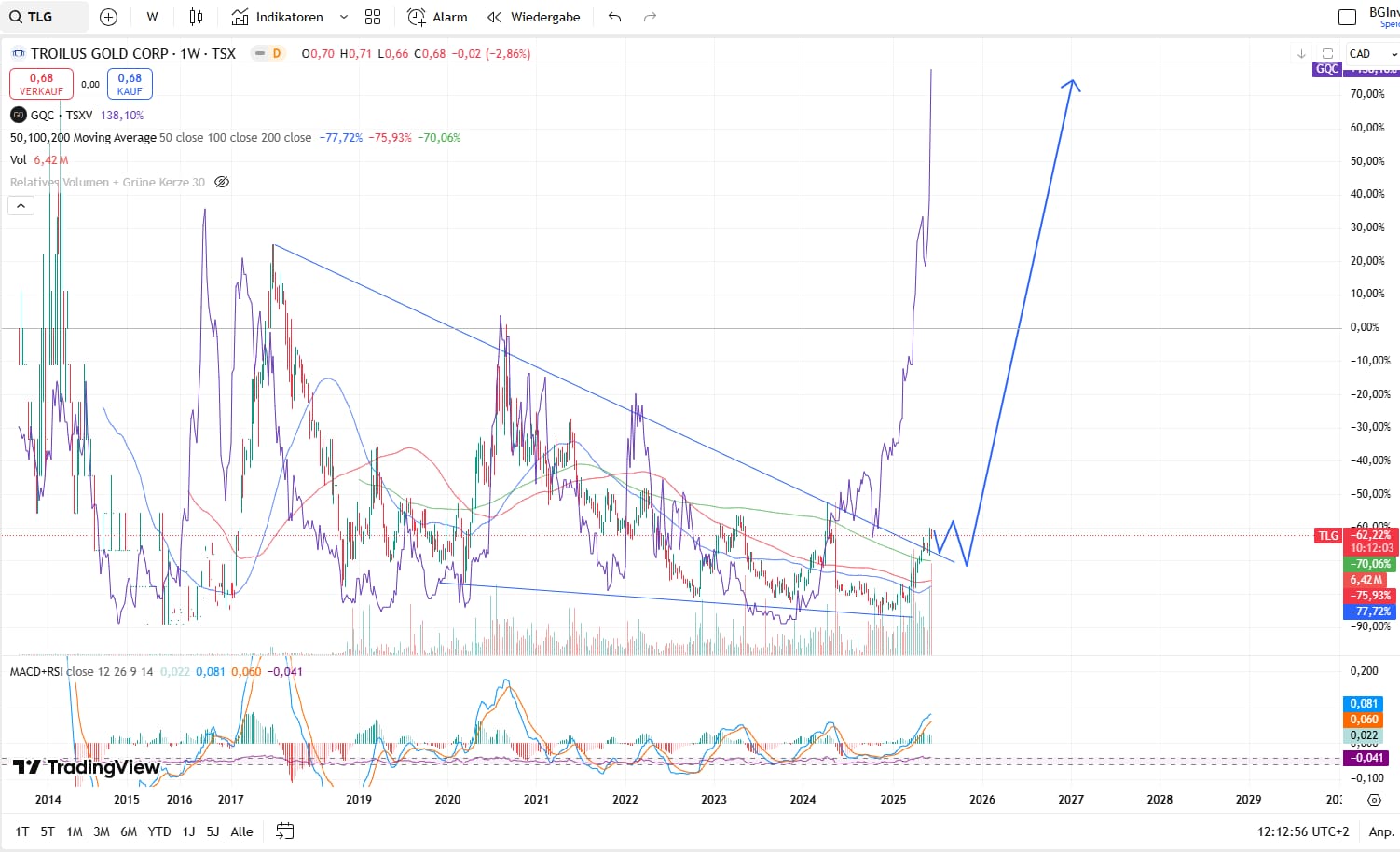 Gut möglich, dass TLG sich jetzt noch etwas am Dreieck "schlängelt", den Ausbruch quasi bestätigt, und dann im weiteren Verlauf einen ähnlichen Weg wie GQC nimmt.