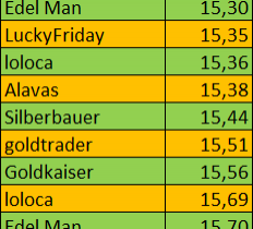 • Bitte um Entschuldigung. Hatte fast drei Tage kein Internet, kein Fernsehen, kein Festnetz und kein Radio. So konnte ich mich also nicht informieren und habe die Tipps an Jemand durchgegeben, dessen Server funktionierte. Leider hat dieser Jemand mir nicht gesagt, daß 15,85 schon getippt war. Also ein Dankeschön an LuckyFriday und an Goldkaiser für die schnelle Reaktion.