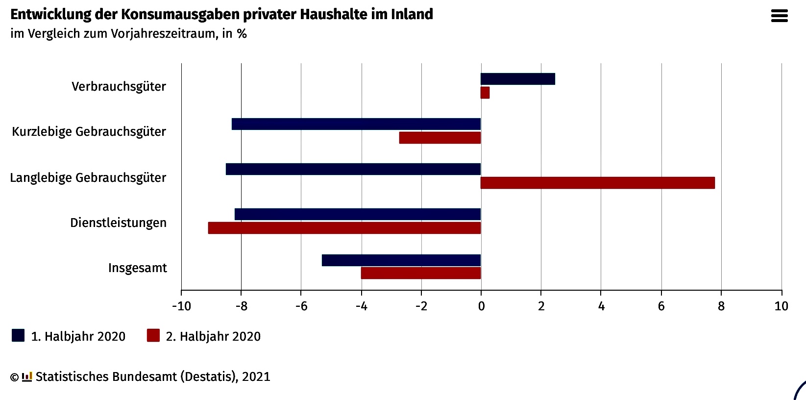 • Wie das Statistische Bundesamt (Destatis) anlässlich des Weltverbrauchertages am 15. März 2021 mitteilt, gingen die Konsumausgaben der privaten Haushalte im Inland nach den Konzepten der Volkswirtschaftlichen Gesamtrechnungen im Jahr 2020 im Vergleich zum Vorjahr um 4,6 % in jeweiligen Preisen und um 5,0 % preisbereinigt zurück. Dies war der stärkste Rückgang seit 1970.