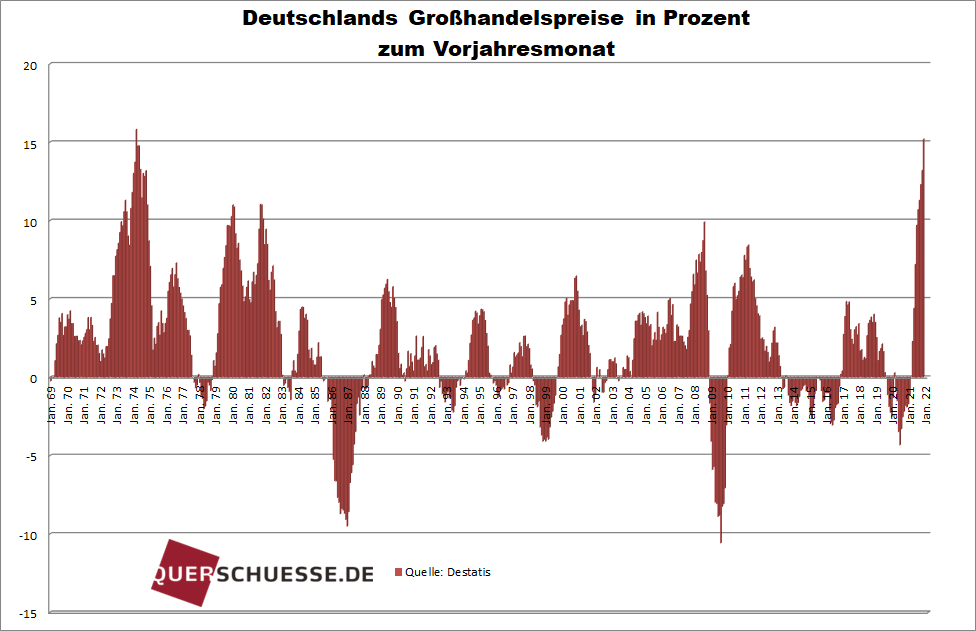 Das Statistische Bundesamt (Destatis) berichtete die Daten zum Großhandelspreisindex für den Monat Oktober 2021. Der Großhandelspreisindex stieg im Oktober 2021 um +15,2% zum Vorjahresmonat. Dies war der höchste Anstieg seit März 1974!