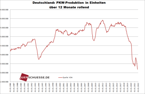 Der Verband der deutschen Automobilindustrie (VDA) berichtete für den Monat November 2021 von einem Rückgang der PKW-Produktion in Deutschland, in Höhe von -31,7% zum Vorjahresmonat, auf nur 307’200 Einheiten.
