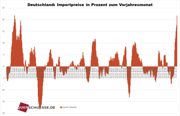 Wie das Statistische Bundesamt (Destatis) mitteilte, stiegen im Oktober 2021 die Einfuhrpreise um +21,7% zum Vorjahresmonat. Dies war der größte Anstieg seit Januar 1980 (zweite Ölpreiskrise).