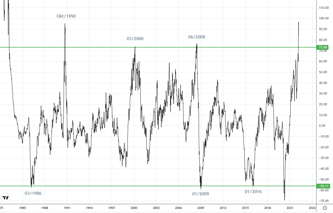 Nach der Erreichung der obere Lage folgte eine kräftige Rezession + Börsencrashs.
