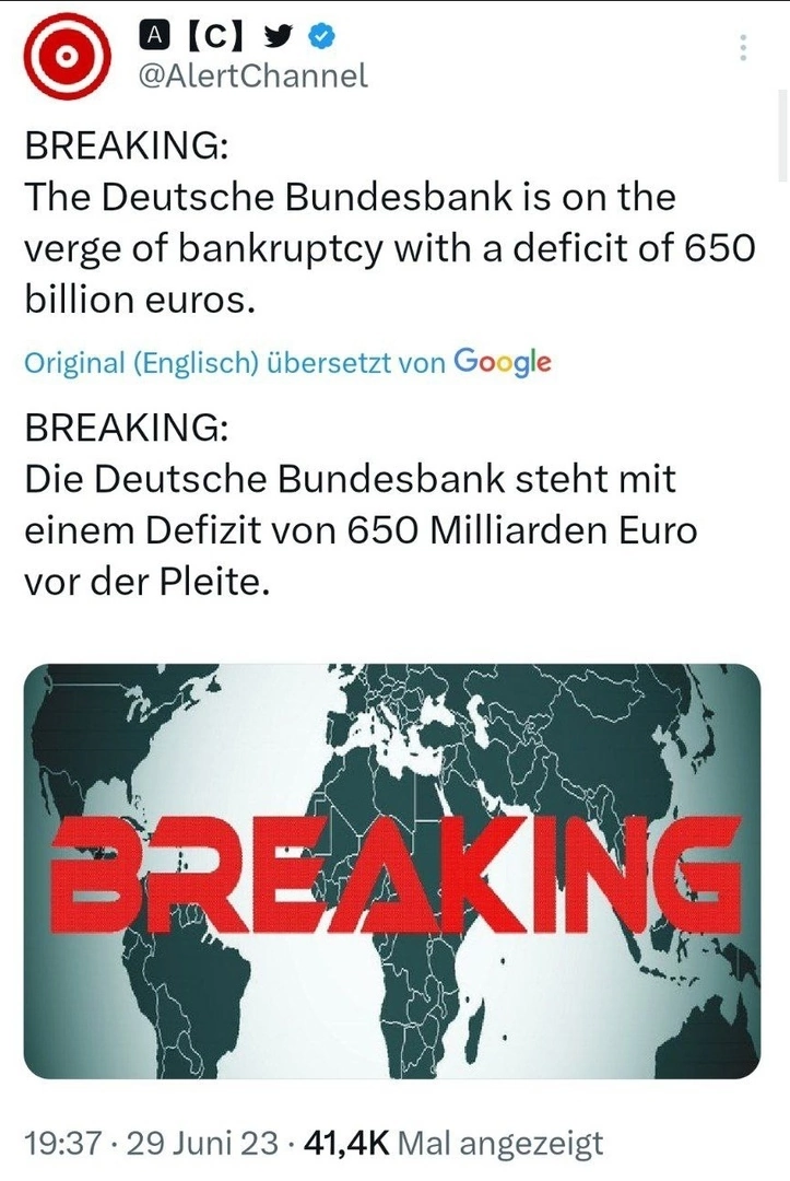 Die Bundesbank hat Ende 2022 Anleihen aus "geldpolitischen Zwecken" (!!!- vielmehr ist das Staatsfinanzierung anderer Staaten ohne Sicherheiten) in Höhe von 1.072.976 Millionen Euro bilanziert. Einem Beschluss des EZB-Rates (nicht demokratisch gewählt, ändert Regeln nach belieben) zufolge muss die Bundesbank den Bestand -wegen der nun gesunkenden Rendite bzw. gestiegener Risiken- n i c h t abwerten !
