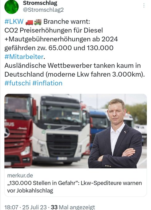 Mit wütender Kritik hat das Speditionsgewerbe auf den Beschluss des Koalitionsausschusses reagiert, die Lkw-Maut deutlich zu erhöhen. „Habeck und Co sollten sich überlegen, ob sie sich ihre Rhabarberschorle künftig nicht besser mit der Bahn vor die Haustür liefern lassen! Denn die beschlossene Verdoppelung der Lkw-Maut ab 2024 ist politisches Harakiri“, sagte Dirk Engelhardt, Vorstandssprecher des Logistikverbandes BGL, dem RedaktionsNetzwerk Deutschland.