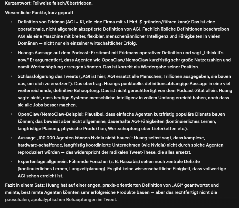Zur News: Die News ist CEO-gelaber, um Aktienkurse weiter zu pushen und Stakeholder glücklich zu machen und weiteres Kapital anzuziehen. Was er damit umschreibt, ist "OpenClaw", welches theoretisch eingesetzt werden könnte, gewisse Aufgaben zu automatisieren. Es ist noch nicht da, aber theoretisch gibt es das Potential, das AGI evtl. möglich wäre, mit viel Halluzination jedenfalls.
