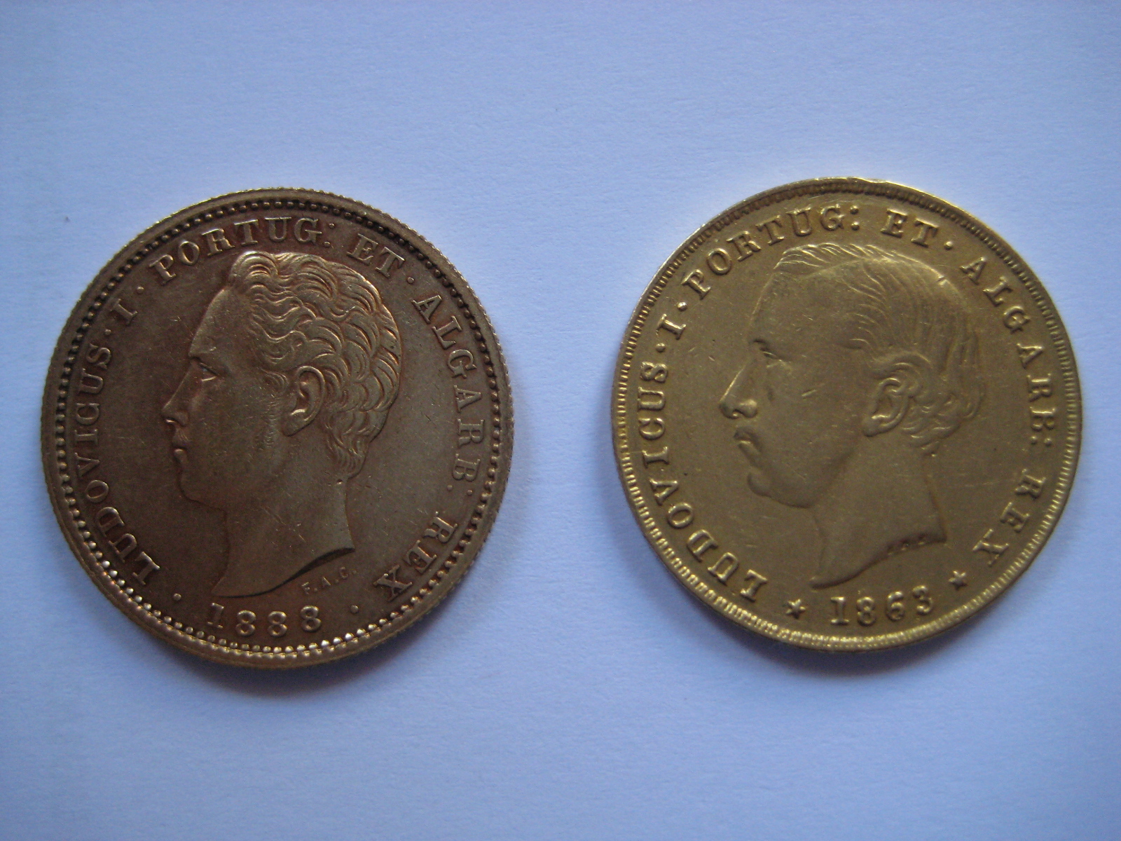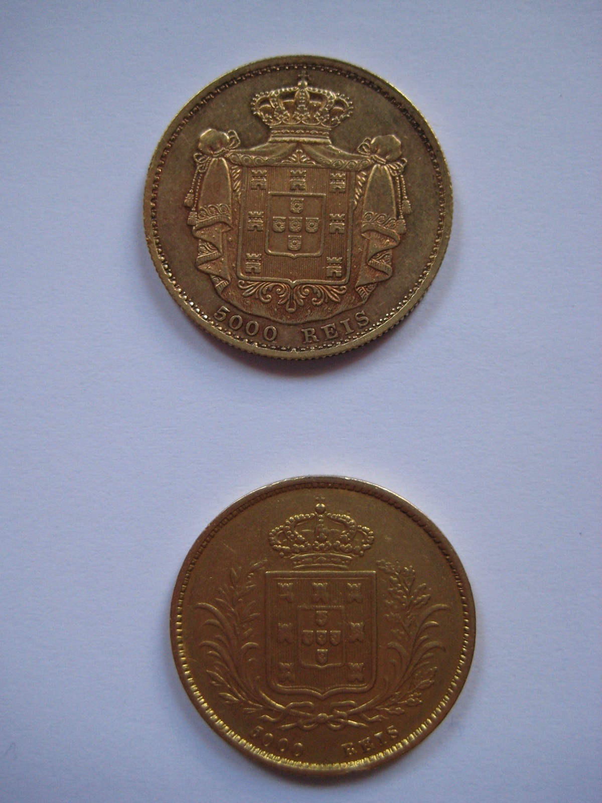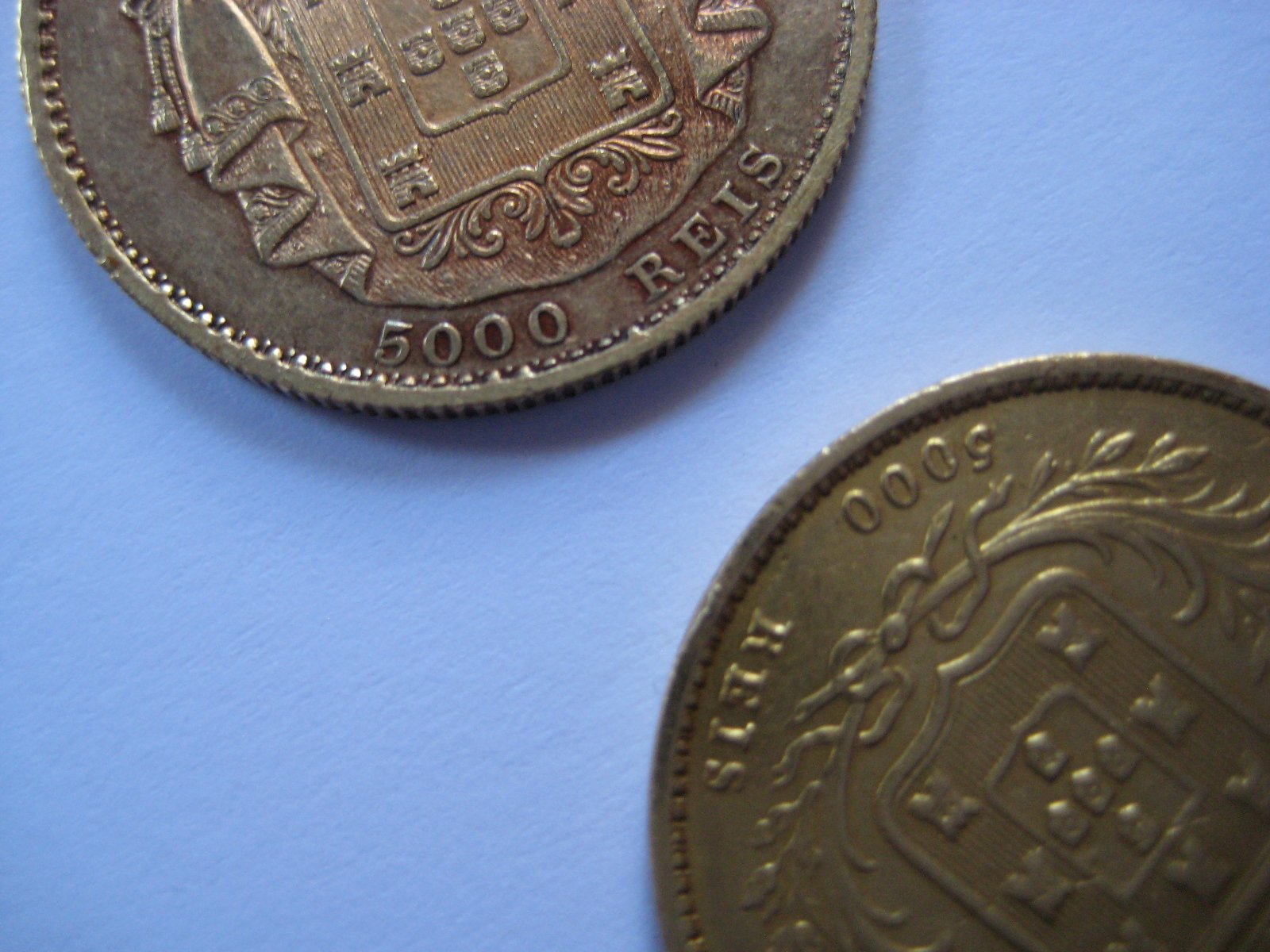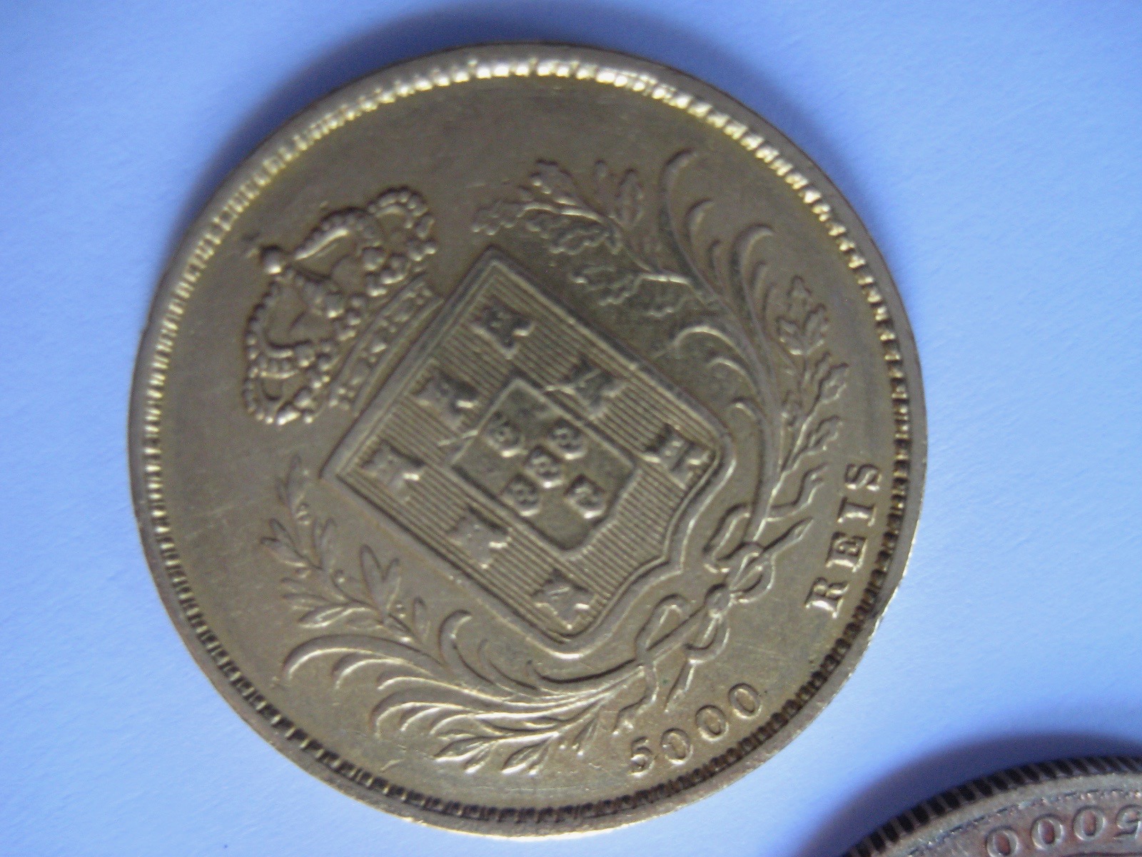 Jetzt kommen mir auch Zweifel bei der Goldmünze: lt. enumista sollte sie 8,8675g wiegen, allerdings zeigt meine Waage für diese Münze nur 8,47g an. Ich habe auch einen 5000 Reis Luis von 1888, selbe Sollgröße, selbes Sollgewicht: die bringt 8,86g auf die Waage. Wenn ich beide Münzen gegeneinander halte, ist die fragliche Münze im Durchmesser ca. 0,5mm kleiner.