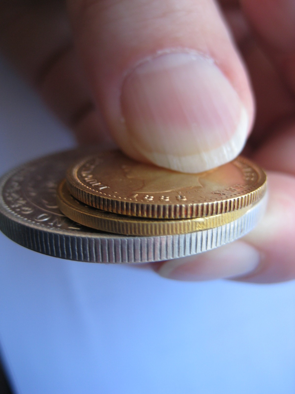 Der Link zur Münze, die Bilder sind hier klarer als mit meiner Digicam. Beim Photo der Ränder habe ich beide Reis' mit der o.g. vermutlich falschen Dollarsilbermünze (hier nämlich derselbe komische Rand) zusammengehalten - der 1863er ist der in der Mitte.