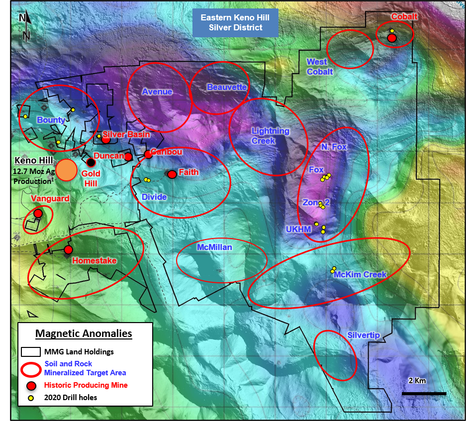 Metallic Minerals veranstaltet am Montag, den 22. Februar, um 13:00 Uhr PST / 16:00 Uhr EST ein Live-Webinar, bei dem der Vorsitzende & amp; Greg Johnson, CEO, wird die Ergebnisse der ersten Phase der Bohrungen im Jahr 2020 und die Pläne des Unternehmens für das zweite Quartal, einschließlich der bevorstehenden Explorationssaison 2021, erörtern. Klicken Sie hier, um sich zu registrieren.Abbildung 1 - Bohrlochpositionen in East Keno 2020 und geochemische Ergebnisse des Bodens Abbildung 2 - Magnetische Vermessung und Bohrlochpositionen in East Keno