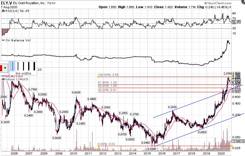 Die Korrektur bei Ely Gold Royalties sollte bald beendet sein. Das 50% Retracement in USD liegt bei $0,77. Das haben wir noch nicht ganz erreicht.