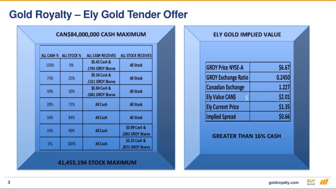 The transaction has been structured with the Gold Royalty stock/cash option to ensure that Gold Royalty, with its management and its NYSE listing, will be considered as the surviving entity resulting from the business combination. At the transaction valuation, had Gold Royalty agreed to acquire Ely Gold in an all-stock transaction, Ely Gold shareholders would end up owning over 50% of the combined entity.