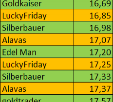 des jeweiligen Gesamteinsatzes der Silberspieler + "x" (s. o.). - Bei Mehrfachbelegung eines Platzes also bspw. zweie ersten Siegern werden die Gewinne der Doppeltipper durch zwei geteilt. Bedeutet, wenn 1. und 2. den gleichen Tipp abgegeben haben, so wird der Gewinn geteilt 50% : 2 = 25 % aller Münzen für beide Erstplatzierten, anzuwenden auch bei mehr als zwei Doppeltipps und auf allen Plätzen analog.