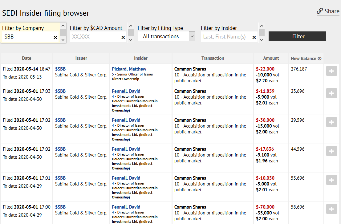 Sabina Gold & Silver / SBB (TSX)