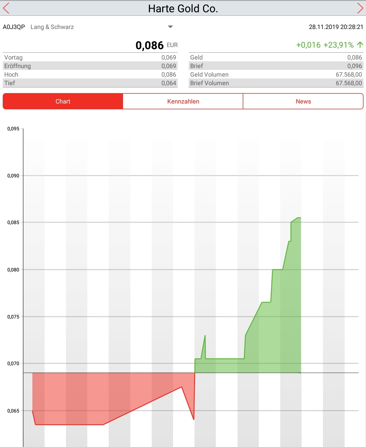 mit plus 40% und Tagesschluss am Top mit 0,19C$. Das entschädigt für diverse Fehlschläge.