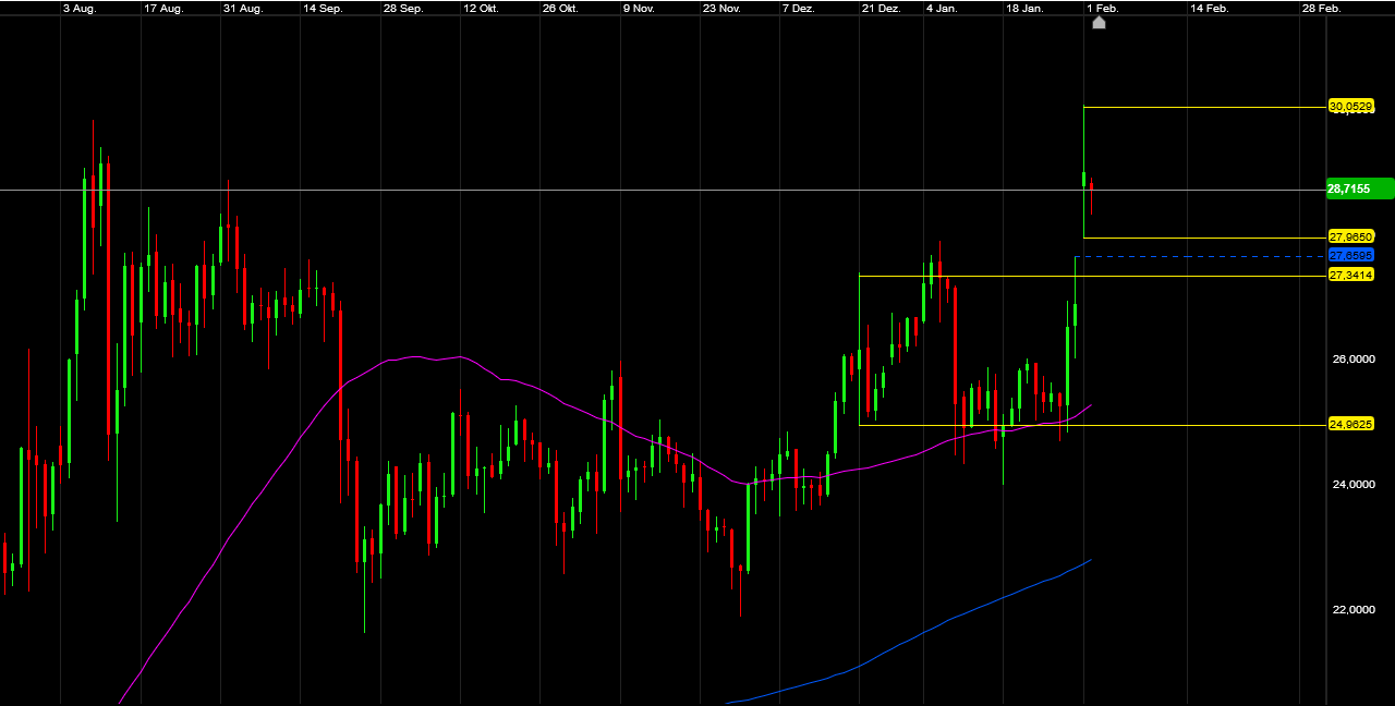 Für einen eigentlichen Shortsqueeze hat es zwar nicht gereicht, aber der Silberpreis wurde zwischenzeitlich um 12 % auf über 30 $ getrieben. Die Silberlinge lieferten ein Feuerwerk, die Promotionskampagne ist gelungen. Ob sie auch nachhaltig ist, wird sich weisen. Wir werden mit einem Bearish Doji Star aus dem Handel gehen.