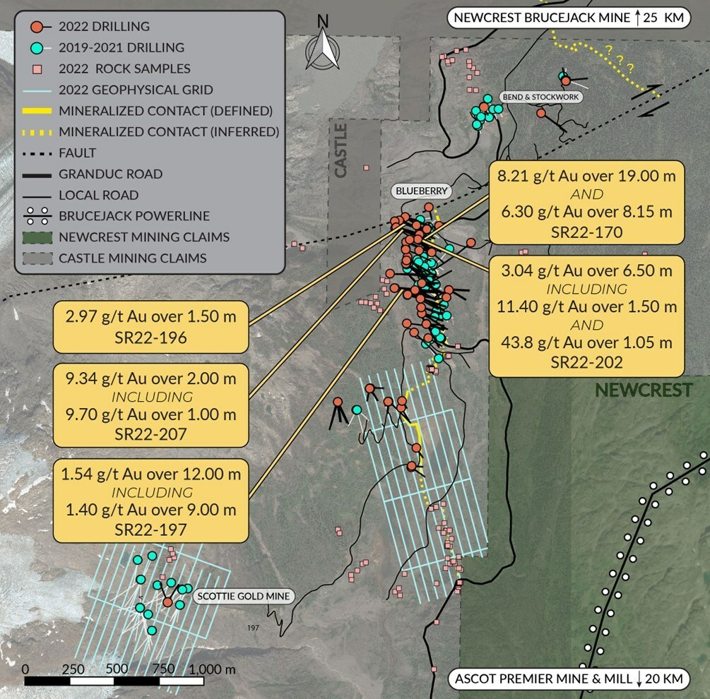 President und CEO Brad Rourke: "Eines unserer Hauptziele dieser Bohrsaison war es, die Tiefe der Zone Blueberry Contact zu erweitern. Dieser erste tiefe Test erhöht die Tiefe der Mineralisierung um 60 % auf insgesamt 360 Meter, und wir haben mehrere tiefere Bohrlöcher, die noch auf ihre Ergebnisse warten. Unser Programm 2022 ist weiterhin in vollem Gange, wobei drei Diamantbohrgeräte weiterhin die Zone Blueberry Contact erproben. Angesichts der positiven Bohrergebnisse zu Beginn der Saison und der Ergebnisse der vor kurzem gebohrten Löcher haben wir beschlossen, das Programm auf 16.500 Bohrmeter zu erweitern, um zusätzliche Erweiterungsziele entlang des Kontakts zu erproben. Da in dieser Saison bereits über 75 Bohrlöcher gebohrt wurden und bisher nur 6 gemeldet wurden, freuen wir uns darauf, im Laufe des Herbstes positive Nachrichten zu liefern."