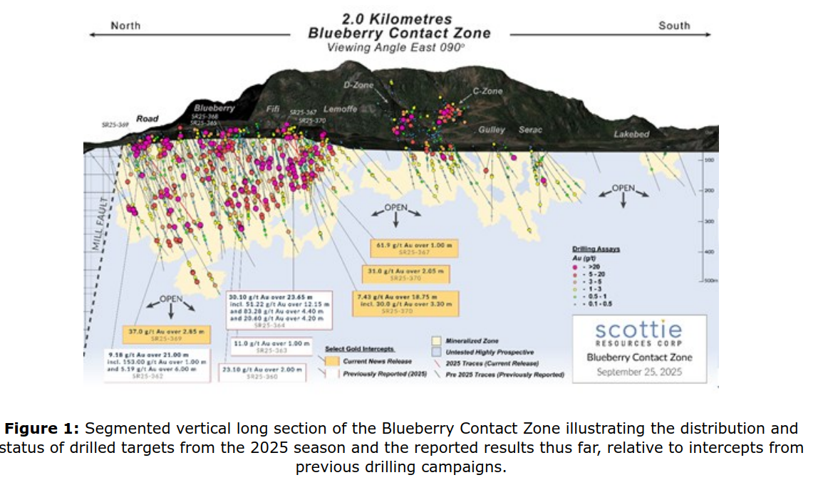 Vancouver, British Columbia--(Newsfile Corp. – 25. September 2025) – Scottie Resources Corp. (TSXV: SCOT) (OTCQB: SCTSF) (FSE: SR80) („Scottie” oder das „Unternehmen”) freut sich, neue Untersuchungsergebnisse aus seinen Bohrungen im Jahr 2025 in der Blueberry Contact Zone im Rahmen des Scottie Gold Mine Project bekannt zu geben. Das über Straßen erreichbare Scottie-Goldminenprojekt, zu dem die zu 100 % unternehmenseigene, ehemals produzierende Scottie-Goldmine und die angrenzende Blueberry-Kontaktzone gehören, befindet sich 35 Kilometer nördlich von Stewart (British Columbia).