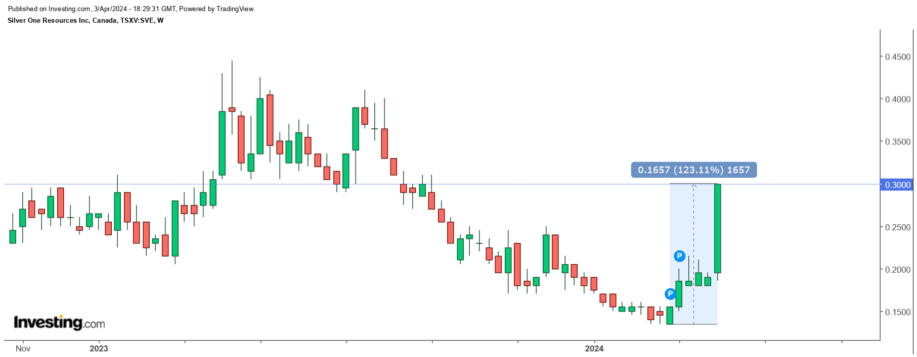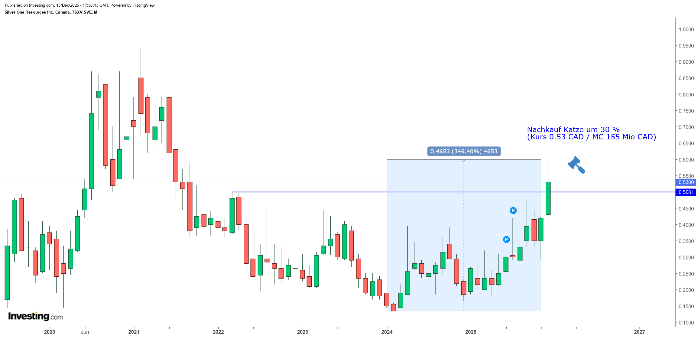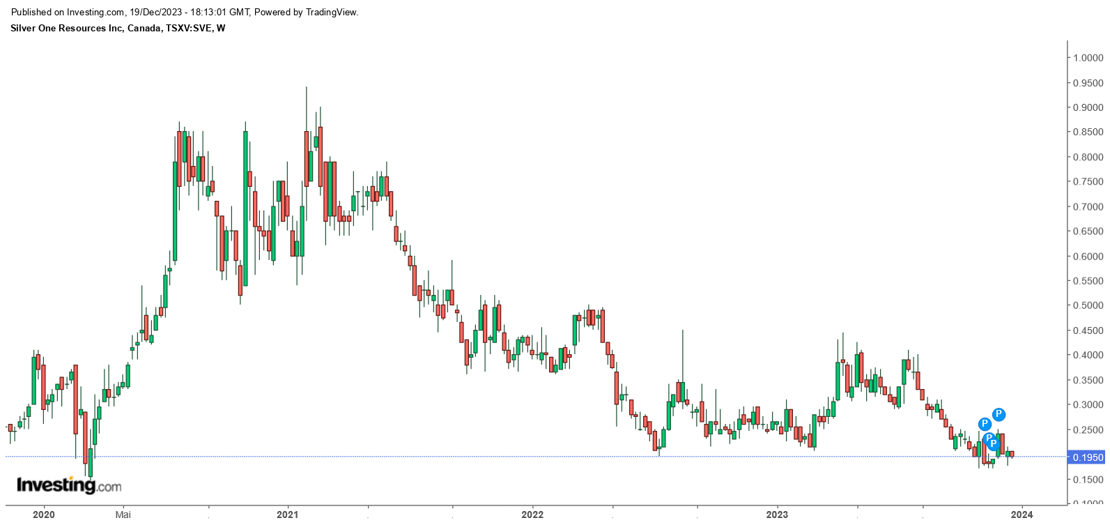 Silver One Resources is developing a large silver project (Candalaria) in Nevada. It is a past producing mine and permitting should not be difficult. It has a large historical resource of 46 million oz. (105 gpt) M&I and 84 million oz. Inferred (45 gpt). Plus, it has excellent exploration potential.