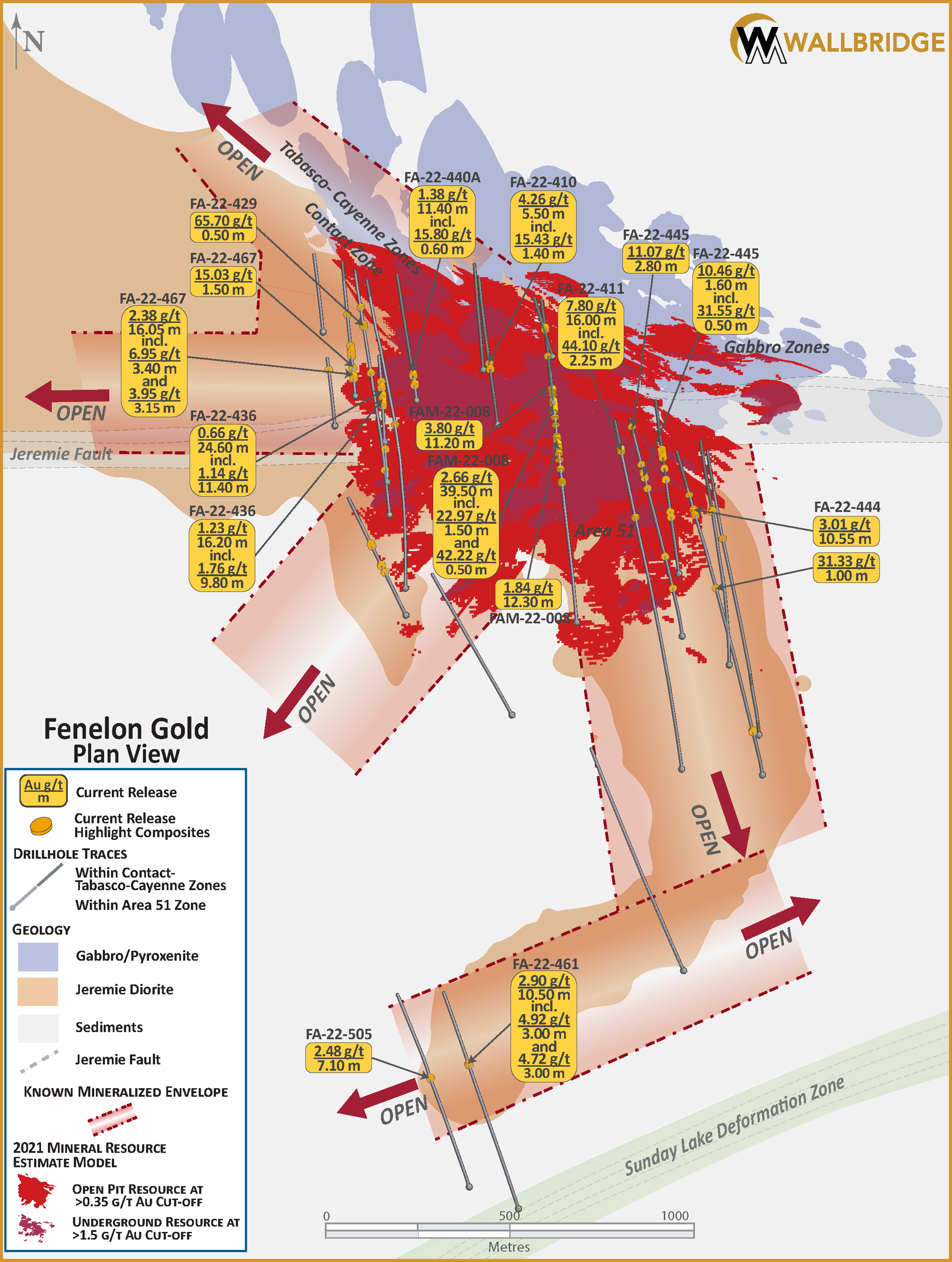 Toronto, Ontario – March 6, 2023 – Wallbridge Mining Company Limited (TSX:WM, OTCQX:WLBMF) (“Wallbridge” or the “Company”) is pleased to report that new assay results from the 2022 exploration program at the Company’s 100%-owned Fenelon Gold project (“Fenelon”) have expanded the Area 51, Tabasco and Contact zones beyond the western and eastern limits of the 2023 Mineral Resource Estimate (“MRE”) footprint. These results underscore the potential to further increase the size of the deposit, which remains open in multiple directions.