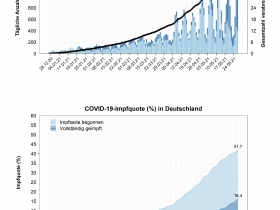 Man sieht im unteren Bild, dass die Startpunkte der Impfungen (1 bzw 2) ca 4 Wochen auseinander liegen, die Steigung der Kurven aber 6 Wochen auseinander liegen und auch noch dass die Steigung der Zweitimpfungen sichtbar flacher ist. Im oberen Bild erkennt man auch die Trendwende deutlich. Die zahl der Erstimpfungen geht stark zurück, obwohl nun Impfungen für alle verfügbar und keine Beschränkungen mehr vorhanden sind. Bei den Zweitimpfungen ist der Trend noch nicht erkennbar nach unten, auch wenn der letzte dunkelblaue Balken kleiner ist als der Vorletzte. Auf alle Fälle hätte die Zahl steigen müssen, wenn alle Erstgeimpfte auch die Zweitimpfung gewollte hätten.