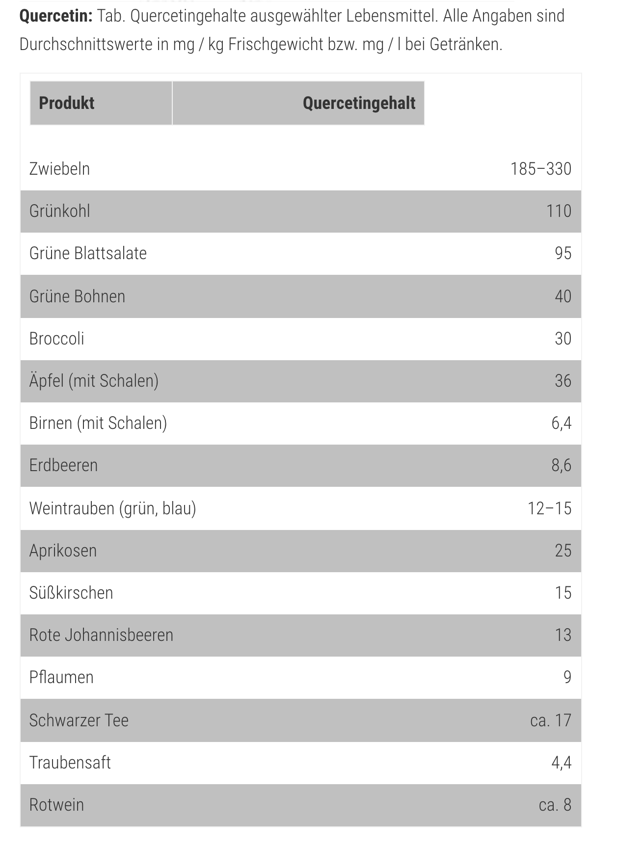 Und Quercetin bekommt man ganz einfach indem man 2-3 Zwiebeln klein schneidet und diese dann 10-15 Minuten mit ca. 1,5 Tassen Wasser pro Tasse Endprodukt leicht köcheln lässt. Anschließend durch ein feines Sieb geben und diesen Zwiebelsaft dann etwas abkühlen lassen und trinken.