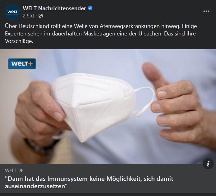 Die WELT ist übrigens das selbe Nachrichten Blatt welches damals behauptet hat das nur Querdenker keine Masken tragen, Masken gesund sind und Beiträge gebracht haben wo sie für jedes Bundesland aufgeschrieben haben wie hoch das Bußgeld beim Verstoß gegen die Maskenpflicht ist.