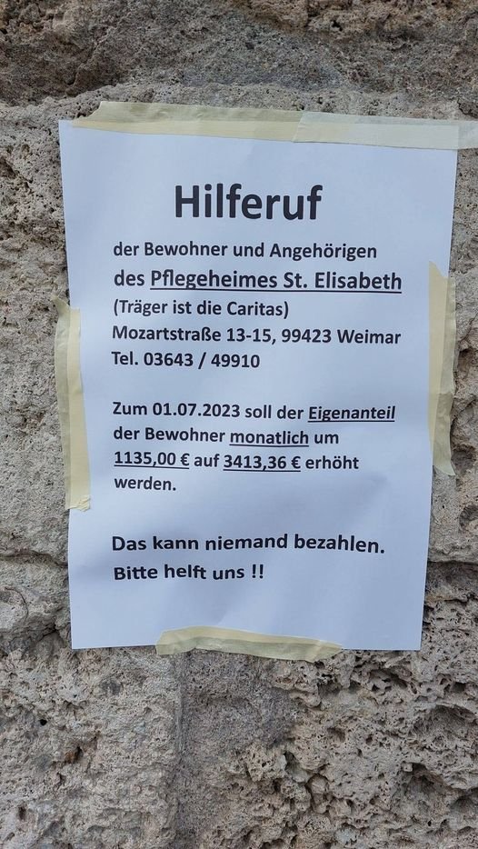 Wie viele werden bald auf der Straße leben? Wie viele leben schon? Naja, ist ja Sommer, daher kann man die Zuckerbrot ja genießen. Wieso soll man sich gegen all den Wahnsinn auflehnen, wenn es "augenscheinlich" gerade einem gut geht. Auch im Heim unseres Schwiegervaters, Erhöhung des Eigenanteils, von bisher 2400,-€ monatlich--- auf 3200,-€ (Heim in Sachsen Anhalt ), ab 08/2023Leute, es bringt nichts was fürs Alter auf die Kante zu legen... max. 10 000 €, den Rest gebt aus !Das Geld wird im Falle eines notwendigen Einzuges ins Pflegeheim regelrecht aufgefressen und mehr,- bessere Leistungen erhält man auch nicht, als Senioren bei denen die Sozialkasse einspringt.Das Problem ist doch, unsere Senioren haben keine Lobby und unsere Kranken ,- Dementen,- Pflegebedürftigen Senioren erst recht nicht.Sie Kosten nur Geld, die Rente wird nun schon doppelt versteuert, max. die Pharmaindustrie kann ihre Produkte an den Mann"" bringen und evtl. noch austesten.Keiner in der Politik nimmt sich diesem Thema mal ernsthaft an und ist gewillt sich gegen den Raub aufzulehnen.