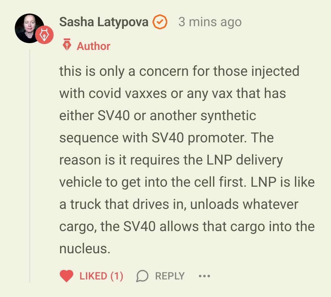 To summarize: Pfizer encoded an undisclosed “gene” into the DNA matrix from which mRNA is being made for covid injections. Then they left huge amounts of this raw material in the final product. The purpose of this undisclosed component is to ensure that whatever it is attached to is delivered not just into the cell, but into the cell’s nucleus (where the human DNA resides).