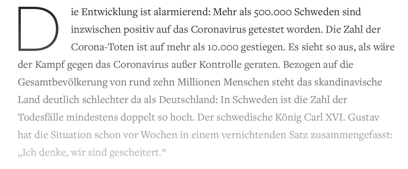 Wenn man davon ausgeht, dass in Deutschland ca. 8x soviel Menschen leben wie in Schweden, kommen die Skandinavier aktuell besser durch die 2. Welle als wir.