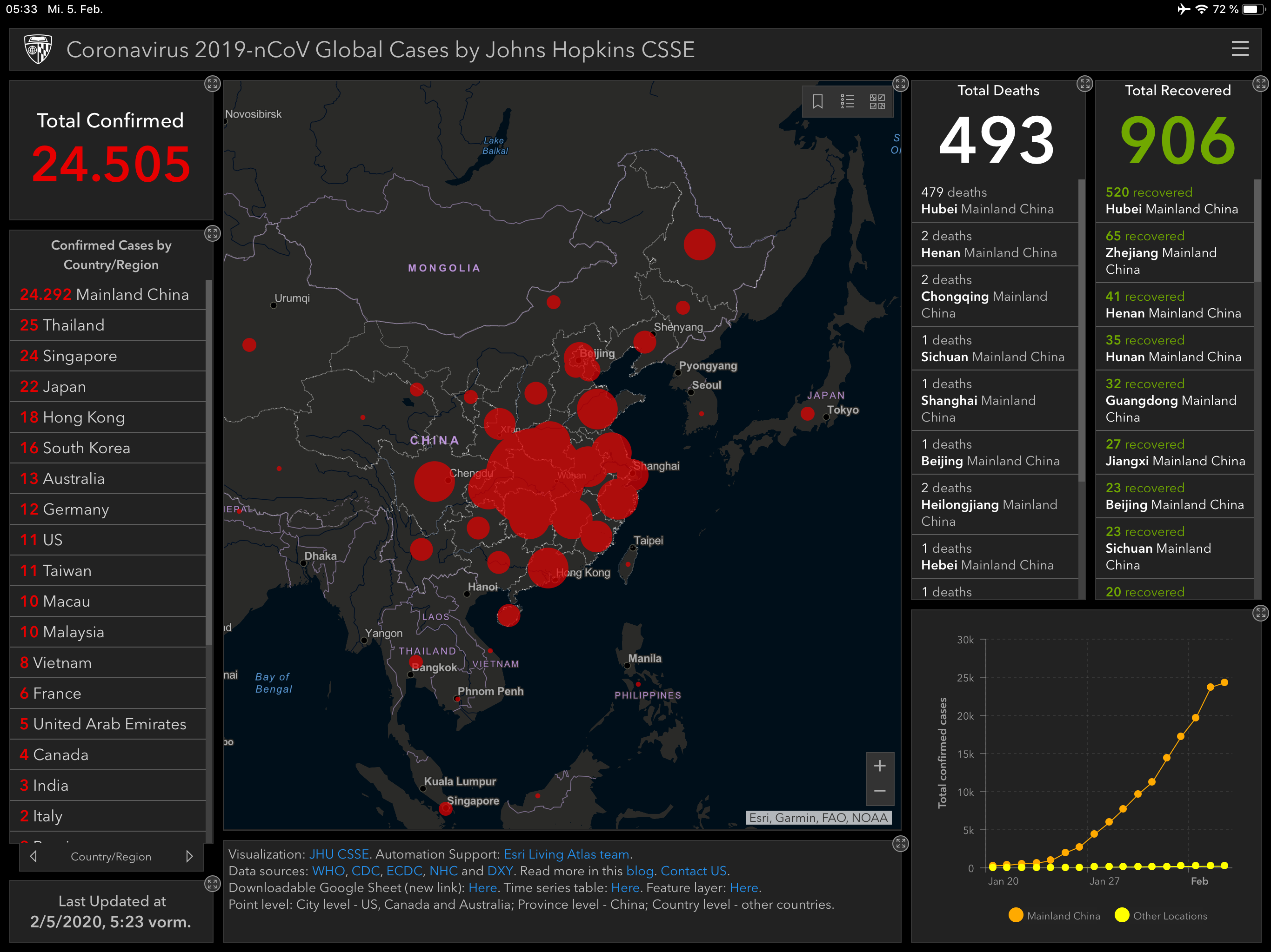 Aktuell gibt es 20.705 Infizierte (weltweit), wobei sich die Erhöhung fast ausschließlich im den asiatischen Raum erfolgte.