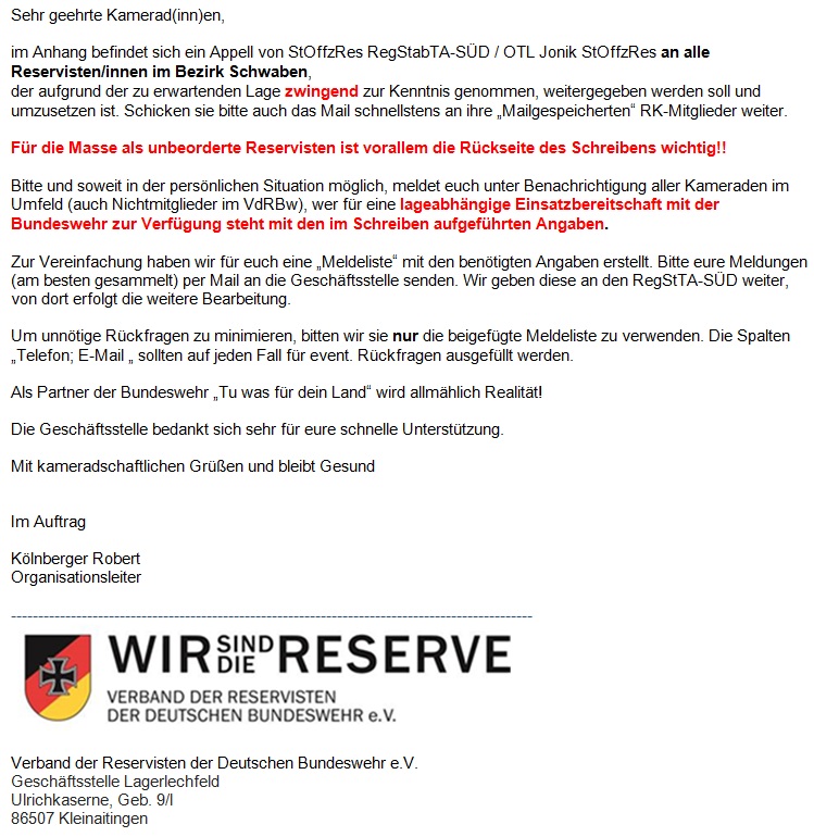 Ist definitiv eine Stufe weiter als noch vor einigen Tagen. In der letzten entsprechende Rundmail eines Reservistenverbandes, die ich gesehen habe, hieß es noch sinngemäß das man sich für den enormen Zuspruch bedankt, aber darum bittet das sich vorerst nur ehemalige Sanis und ähnliches melden sollen, weil es wohl sehr viele Anfragen nach dem Motto "Ich war zwar Ladeschütze auf nem Leo, will aber trotzdem helfen" gab.
