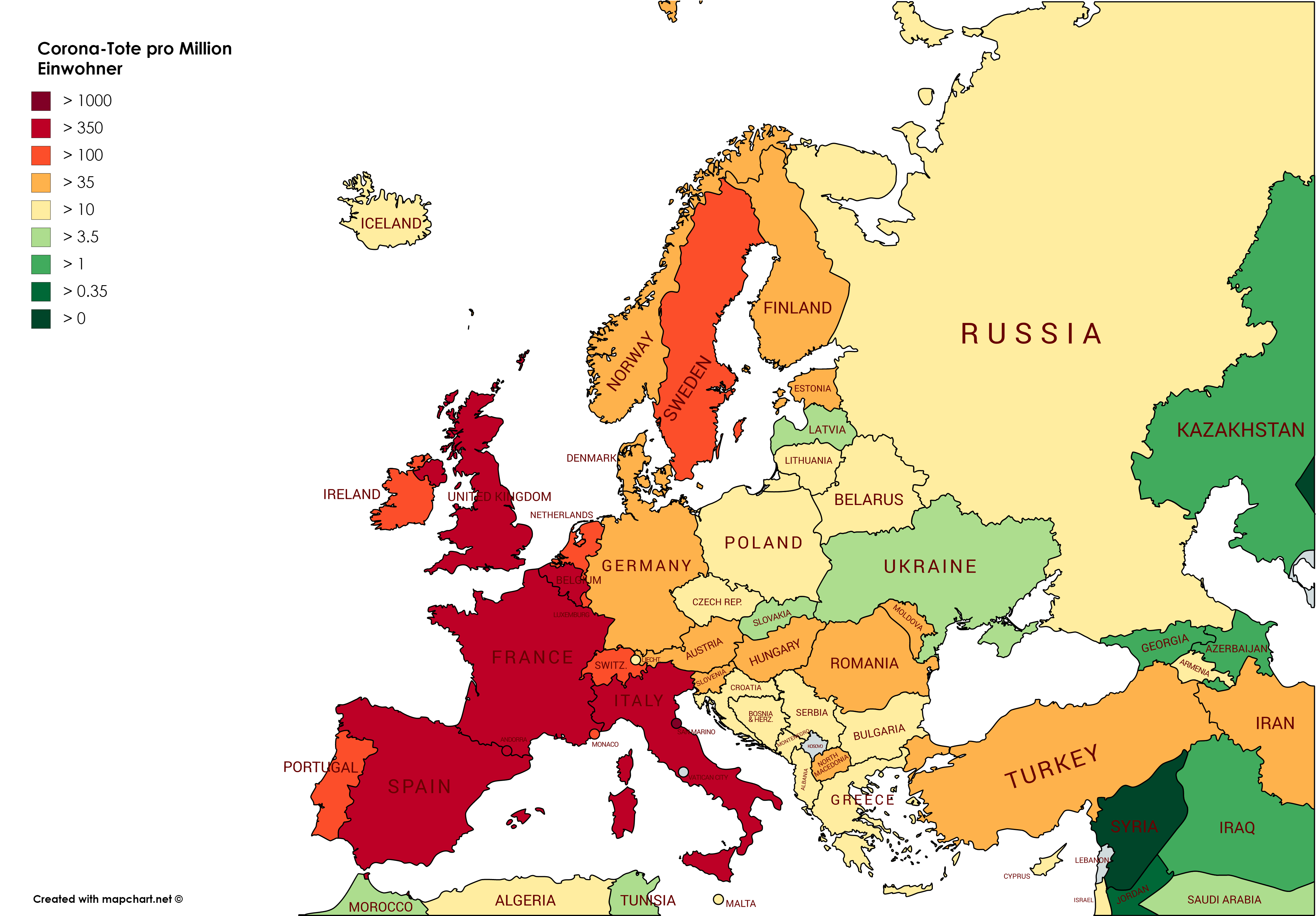 Aktualisierte Anzahl Corona-Tote pro Million Einwohner, in den Ländern Europas.