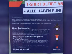 „Heute las ich, dass in HH entlang der Binnenalster Plakate aufgehängt seien, worauf sinngemäß zu lesen steht, dass Männer auf die Entblößung ihres Oberkörpers verzichten mögen. Die Plakate lassen wegen Impressum-Mängel nicht den eindeutigen Schluß zu, ob sie amtlich oder fake sind.„