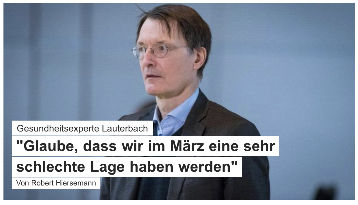"ich glaube, dass die EM komplett abgesagt wird, weil wir im März eine Situation haben werden, die in vielen Ländern Europas schlechter sein wird als heute", sagte Lauterbach zu t-online. "Es wird sich alles – leider – von allein ergeben."