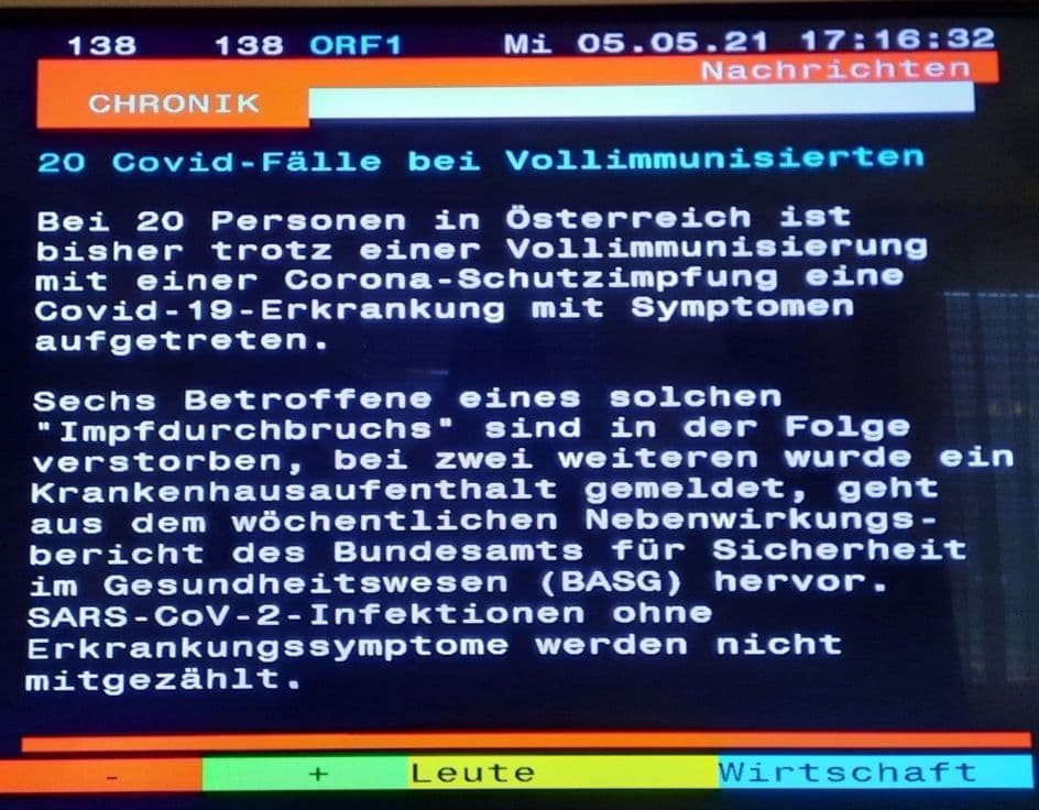 Natürlich darf man mit 99 Jahren auch mal sterben. Aber ein möglicher Zusammenhang mit der Impfung wurde nicht einmal in Erwägung gezogen. Die Angehörigen sind offenbar auch 120%-ige.Was ich sagen will: der Feldversuch wäre ein Versuch, wenn man sich tatsächlich um die "Probanden" kümmern würde. Das geschieht aber praktisch nicht und ist vielleicht auch kaum möglich. Der Feldversuch liefert mit Sicherheit ungenaue Ergebnisse.