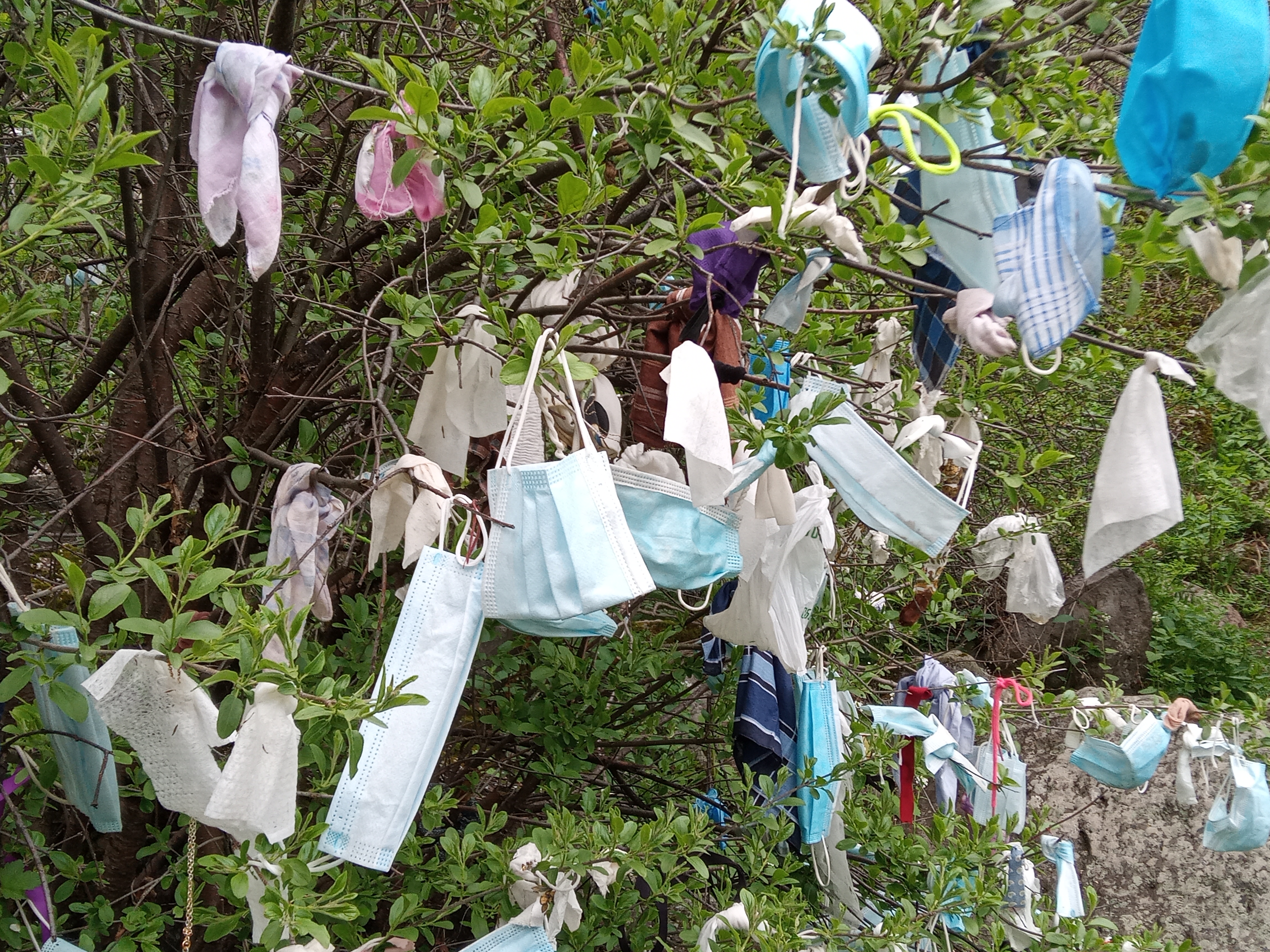 Siehe bitte die Bilder im Anhang: In der Kirche stehen eng nebeneinander Menschen für mehrere Stunden. Die Masken haben die Armeniern meistens an Bäumen gehängt, als apotropäische Geste!