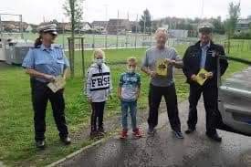 Ich war heute am Rheinufer mit meinem Hund laufen. Kommt eine Wandergruppe (Schulklasse) mit Lehrern.