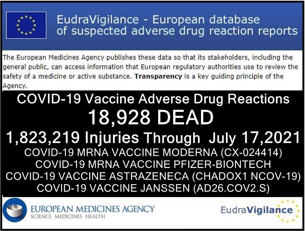 Die EudraVigilance-Datenbank berichtet, dass bis zum 17. Juli 2021 18’928 Todesfälle und 1’823’219 Verletzungen nach Injektionen von vier experimentellen COVID-19-Impfungen gemeldet wurden: