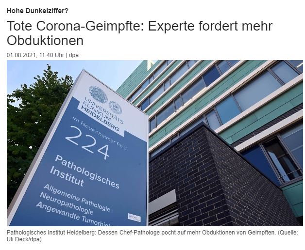 Der Direktor des Pathologischen Instituts in Heidelberg warnt gar vor einer hohen Dunkelziffer an Impftoten und beklagt: Von den meisten Patienten, die nach und möglicherweise an einer Impfung sterben, bekämen die Pathologen gar nichts mit....