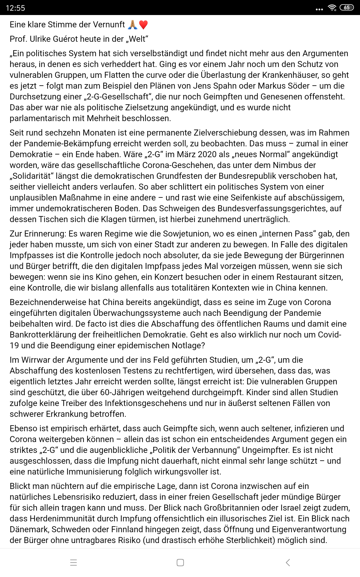 Zu der ursprünglichen Frage, was ich beruflich mache wenn es verpflichtend werden sollte. Noch gehe ich eigentlich davon aus das es sich nur um leere Drohungen handelt um uns zu verunsichern und zur Impfung zu drängen. Sollte diese doch kommen werde ich mich trotzdem mit den aktuell zur Verfügung stehenden Medikamenten nicht spritzen lassen. Was passiert dann? Weiß ich nicht, aber ich kann es gegenüber mir selbst nicht verantworten mir etwas verabreichen zu lassen wovon ich zutiefst überzeugt bin das es sich um etwas schlechtes handelt.